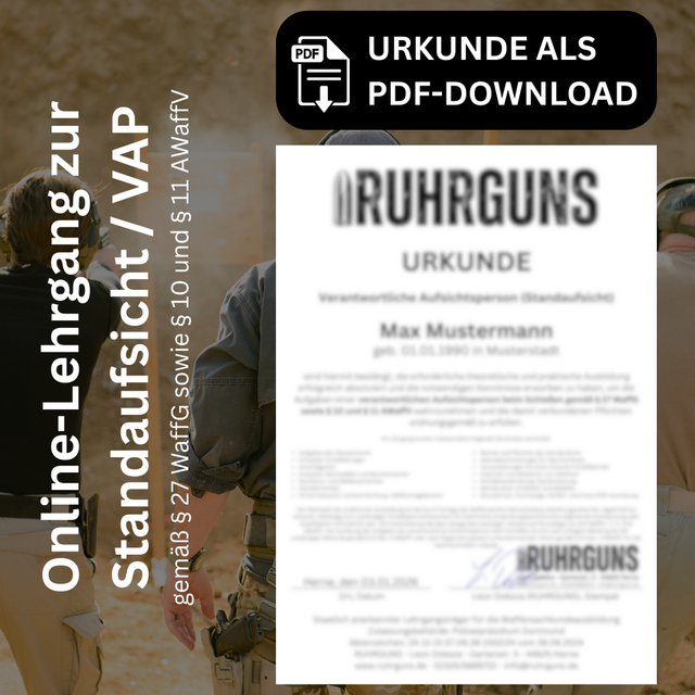 Online-Kurs zur „verantwortlichen Standaufsicht“ – Enthält Online-Lehrgang, Hörbuch zum flexiblen Durchhören und ein Download-Lehrbuch. Bonus: gratis Zugang zum RUHRGUNS-Standaufsichten-Tool mit interaktiven Checklisten, Vorlagen und Updates. Abschluss mit Online-Prüfung (20 Zufallsfragen, bestanden ab 80 % = 16 richtige). Ein Versuch pro Buchung; Nachprüfung 39 € im Shop. Die Urkunde kommt nach bestehen der Online-Prüfung innerhalb weniger Minuten als PDF per Mail.
